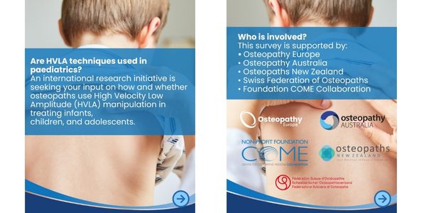 L’utilisation de la HVLA comme technique de traitement manuel pédiatrique a fait l’objet de recherches et de rapports de plusieurs organisations professionnelles. Au nom d’Osteopathy Europe (OE), d’Osteopathy Australia, d’Osteopaths New Zealand et de la Fédération Suisse d’Ostéopathie, nous souhaitons informer les parties prenantes, telles que les décideurs politiques, les patients, les praticiens, les établissements et organismes de formation et les chercheurs, de la position de l’ostéopathie concernant l’utilisation des techniques HVLA dans le traitement des nourrissons, des enfants et des adolescents.